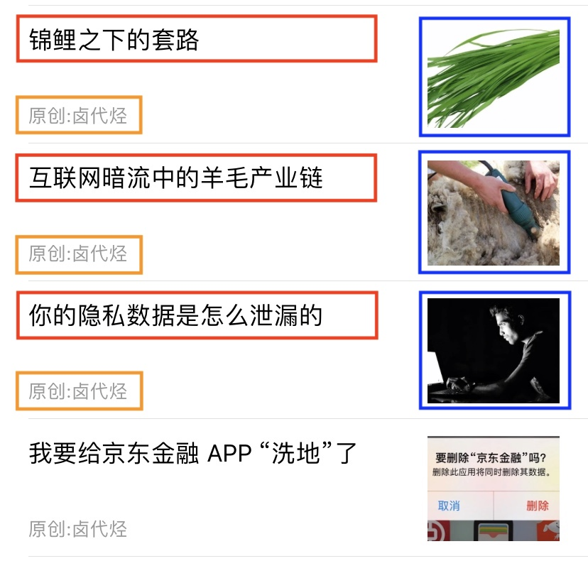 我们下面拿个例子说明一下,下图历史文章的一个截图,我们可以很清晰的看到,每一条推文可以分为三大部分:标题、图片和作者,我们只要找到这个规律,就可以批量的抓取这类数据。