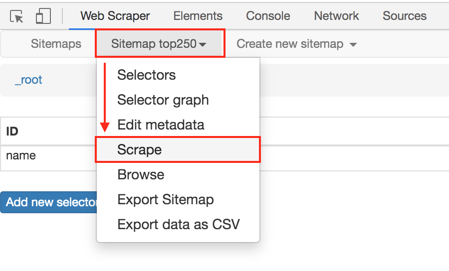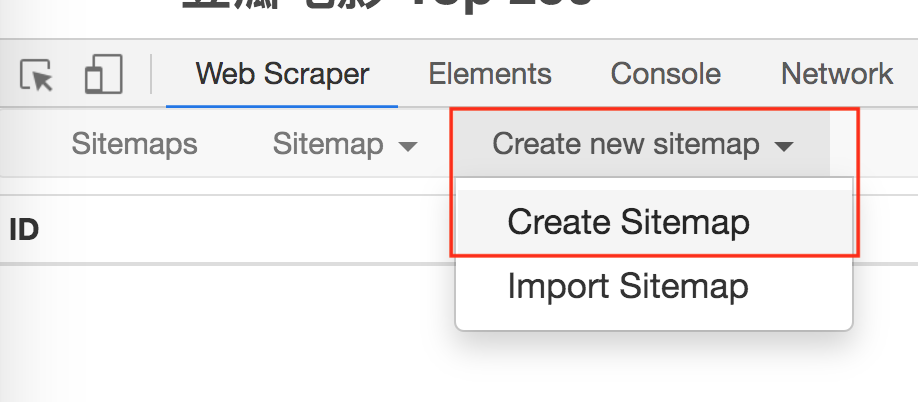 在顶部的 tab 栏,有一个 Sitemap top250 的 tab,这个就是我们刚刚创建的爬虫。点击它,再点击下拉菜单里的 Scrape 按钮,开始我们的数据抓取。
