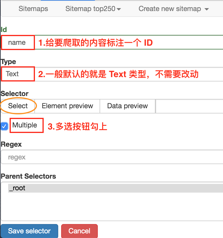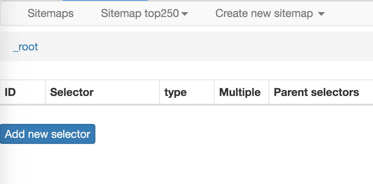 这时候会跳到一个新的操作面板,不要管别的,我们直接点击 Add new selector 这个蓝底白字的按钮,顾名思义,创建一个选择器,用来选择我们想要抓取的元素。