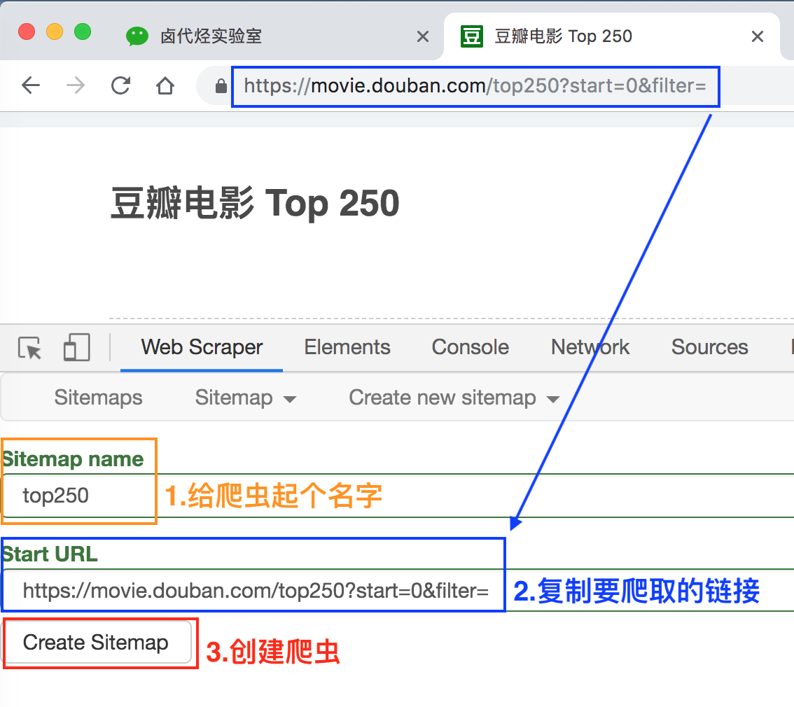 进入 Web Scraper 的控制页面后,我们按照 Create new sitemap -> Create Sitemap 的操作路径,创建一个新的爬虫,sitemap 是啥意思并不重要,你就当他是个爬虫的别名就好了。