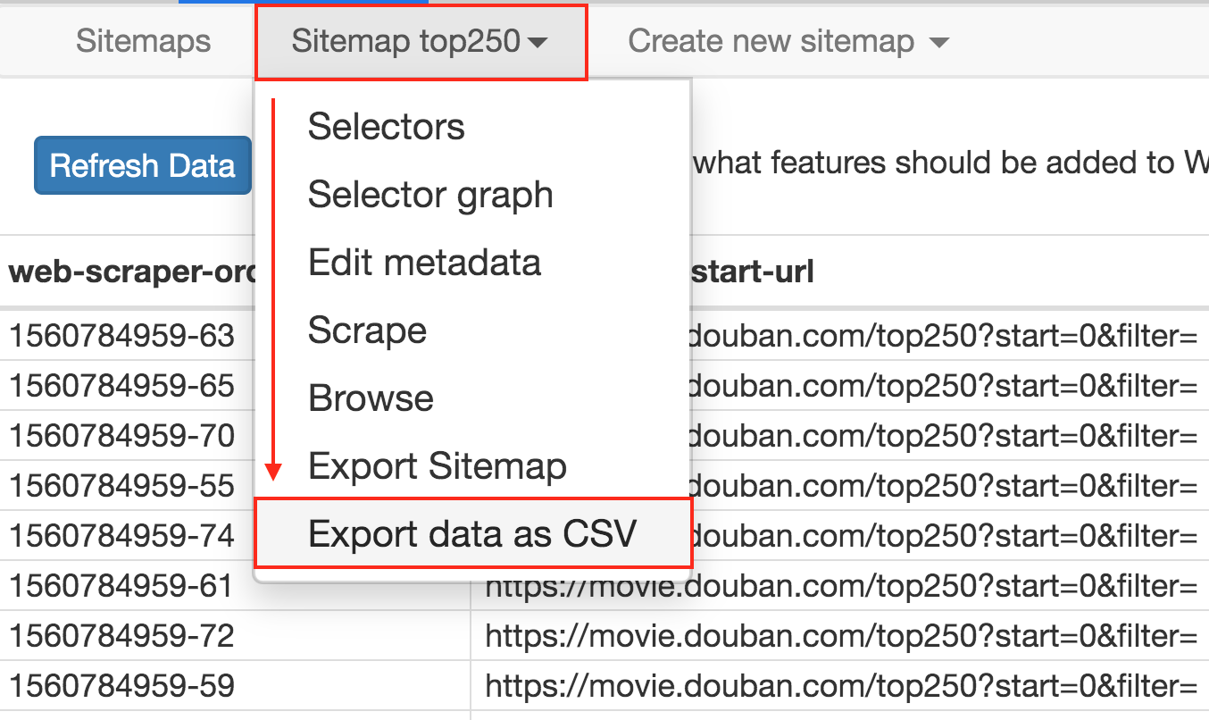 这个数据会存储在我们的浏览器里,我们也可以点击 Sitemap top250 下的 Export data as CSV,这样就可以导出成 .csv 格式的数据,这种格式可以用 Excel 打开,我们可以用 Excel 做一些数据格式化的操作。