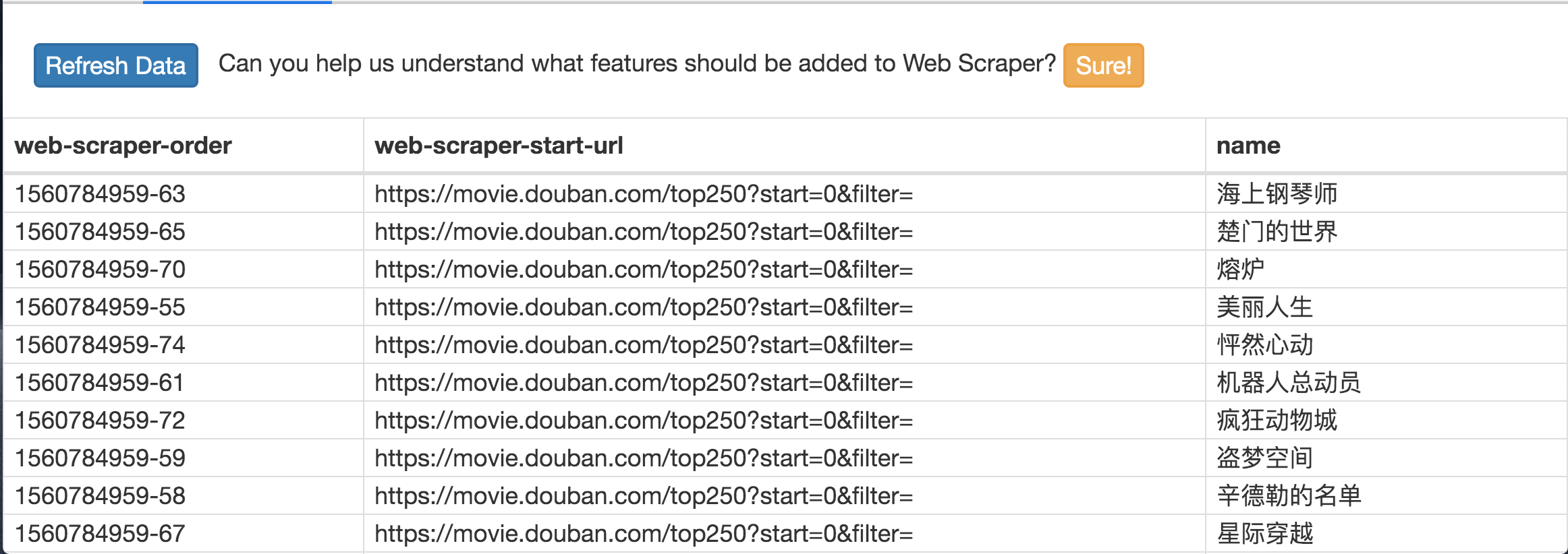 一般弹出的网页自动关闭就代表着数据抓取结束了,我们点击面板上的 refresh 蓝色按钮,就可以看到我们抓取的数据了!