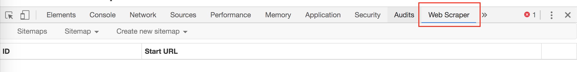 浏览器按 F12 打开控制台,并把控制台放在网页的下方(具体操作可以看上一篇文章),然后找到 Web Scraper 这个 Tab,点进去就来到了 Web Scraper 的控制页面。