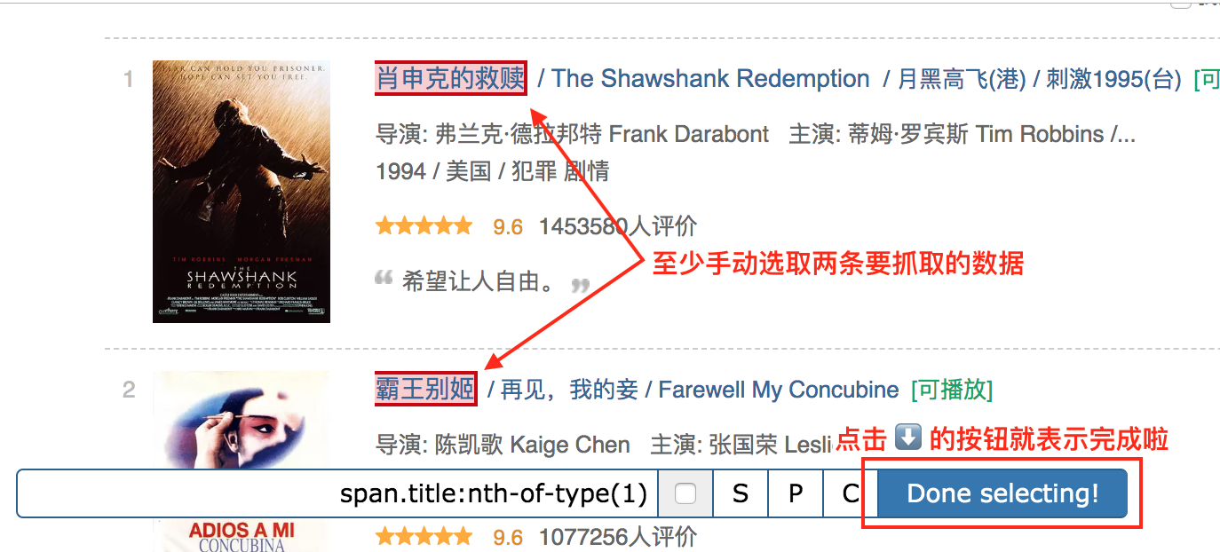 拉动网页检查一遍,发现所有的电影标题都被选中后,我们就可以点击 Done selecting!这个按钮,表示选择完毕;