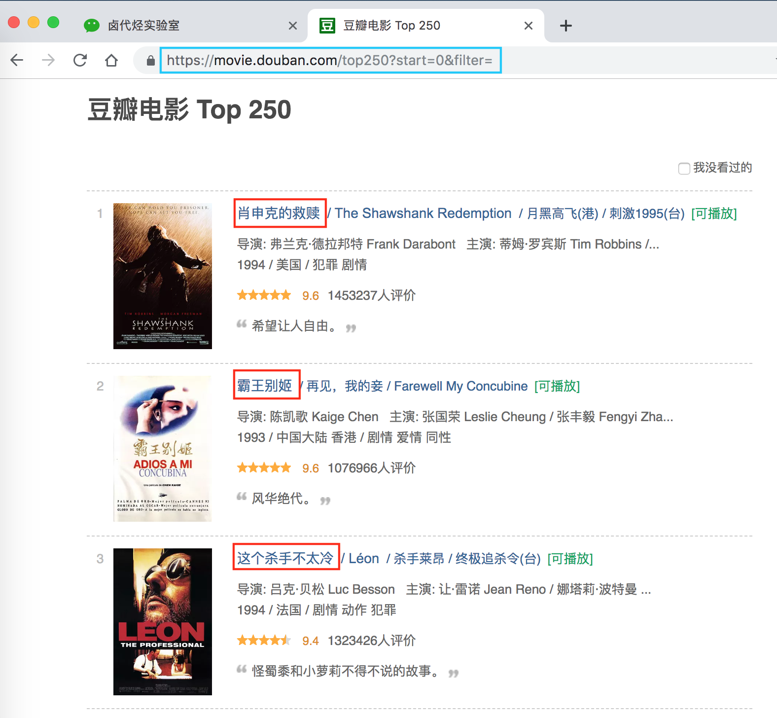 但凡做爬虫练手,第一个爬取的网站一般都是豆瓣电影 TOP 250,网址链接是 https://movie.douban.com/top250?start=0&filter=。第一次上手,我们爬取的内容尽量简单,所以我们只爬取第一页的电影标题。